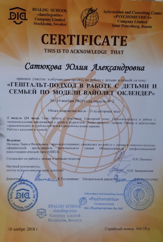 Основатель модели: Вайолет Оклендер - доктор философии, признанный авторитет в области клинической психологии, семейной и гештальт-терапии, а также специального обучения детей. Вайолет Оклендер обращается к гештальт-терапии, как к эффективному методу работы с детьми всех возрастов, который применим не только для индивидуальных, но и для семейных и групповых занятий. Этот подход фокусируется на взаимодействии между терапевтом и клиентом, а не на наблюдении и интерпретации. Это живой , динамичный, игровой подход. Вайолет считает, что исцеление возможно только при условии, что дети найдут выход своим аффектам, научатся заботиться о себе, восстановят и укрепят свое Я. В своей работе Вайолет Оклендер практикует большое количество разнообразных креативных, экспрессивных и проективных техник. Ольга Павловна Сидловская прошла в октябре-ноябре 2018 года курсы повышения квалификации 72 часа в Автономной некомерческой организации дополнительного профессионального образования "СИБИРСКИЙ ИНСТИТУТ ПРАКТИЧЕСКОЙ ПСИХОЛОГИИ, ПЕДАГОГИКИ И СОЦИАЛЬНОЙ РАБОТЫ" г. Новосибирск по дополнительной профессиональной программе "СУДЕБНАЯ ПСИХОЛОГО-ПЕДАГОГИЧЕСКАЯ ЭКСПЕРТИЗА ПО ИСКАМ О МЕСТЕ ПРОЖИВАНИЯ И ПОРЯДКЕ ОБЩЕНИЯ С РЕБЕНКОМ ПРИ РАЗДЕЛЬНОМ ПРОЖИВАНИИ РОДИТЕЛЕЙ" |