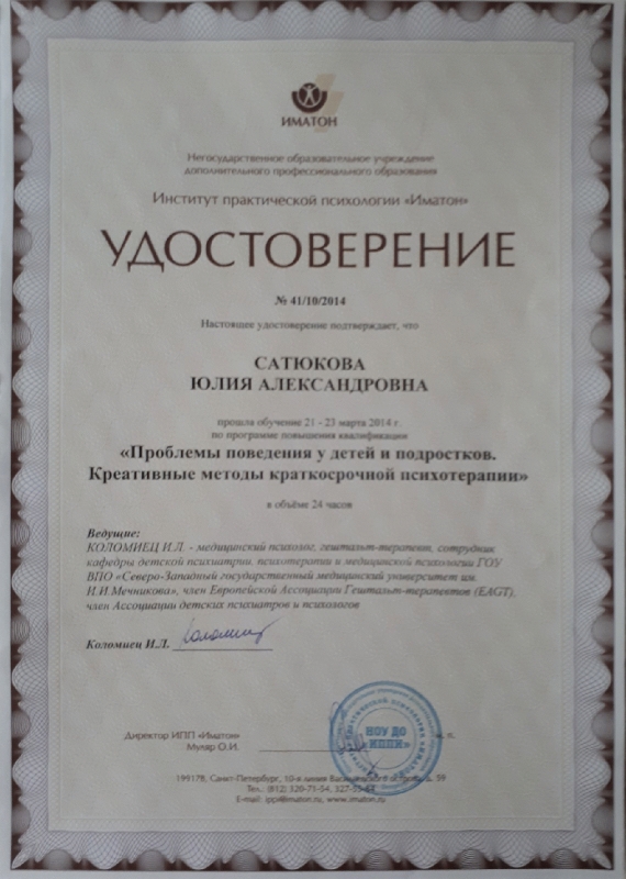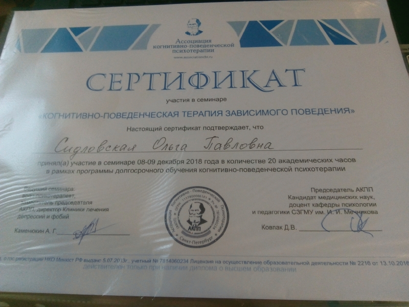 12 октября 2022 Психологи центра постоянно повышают свою квалификацию!Ольга Павловна прошла обучение в ассоциации когнитивно-поведенческой терапии! Ассоциация когнитивно-поведенческой психотерапии (АКПП) создана в 1999 году на базе Клиники Неврозов им. И. П. Павлова. В ее создании участвовали: Ковпак Д. В., Палкин Ю. Р., Курпатов А. В., Каменюкин А. Г., Аверьянов Г. Г. и др. АКПП успешно прошла регистрацию в МинЮсте в 2012 году. Ассоциация имеет государственную лицензию на дополнительное профессиональное образование. Наша Ассоциация первая и единственная негосударственная организация, специализирующаяся на когнитивно-поведенческой психотерапии имеет правовые основания для проведения краткосрочной, среднесрочной и долгосрочных программ и иных форм обучения по когнитивно-поведенческой психотерапии и другие возможности, которые мы пока оставляем как горизонты нашего развития!Ассоциация когнитивно-поведенческой психотерапии объединяет профессионалов в области психического здоровья: психиатров, психотерапевтов, психологов, а также врачей других специальностей. АКПП имеет единомышленников в регионах нашей страны и ближнего зарубежья. АКПП проводит обучающие программы по КПТ разных уровней. Ознакомиться с региональными представителями можно на странцие "Отделения". Расписание расположено в разделе "Мероприятия". Ассоциация имеет официальный канал в YouTube, где размещаются видео с мероприятий, обучающие курса, видео отчеты и другие материалы. Также у АКПП есть официальный сайт на русском языке associationcbt.ru и на английском – associationcbt.org Юлия Александровна прошла Обучающий курс "Детская гештальт-терапия" и получила российский и международный сертификаты.